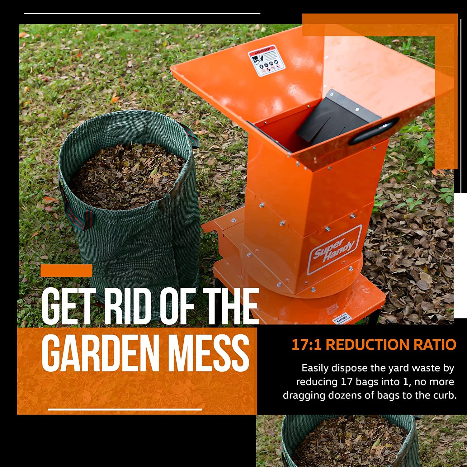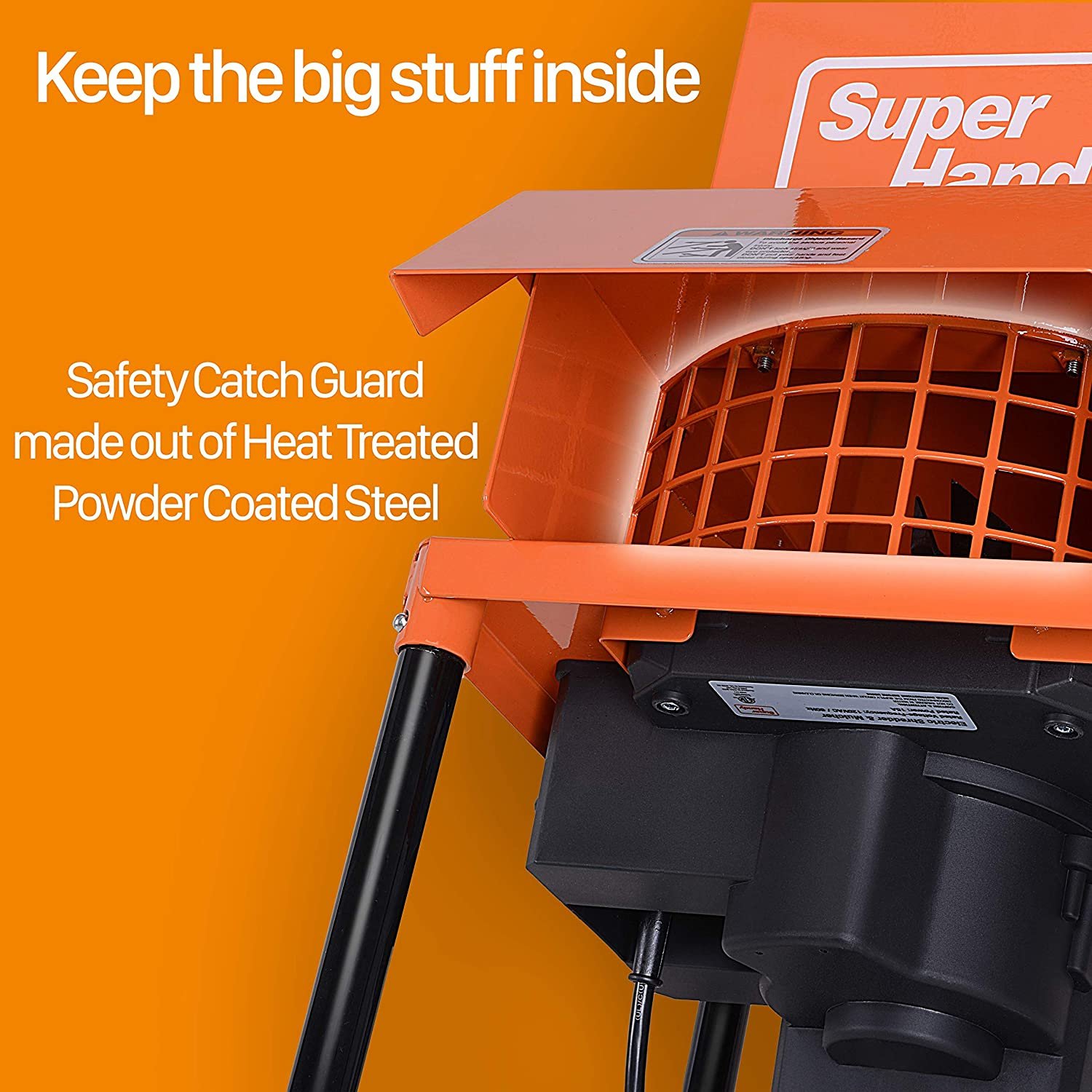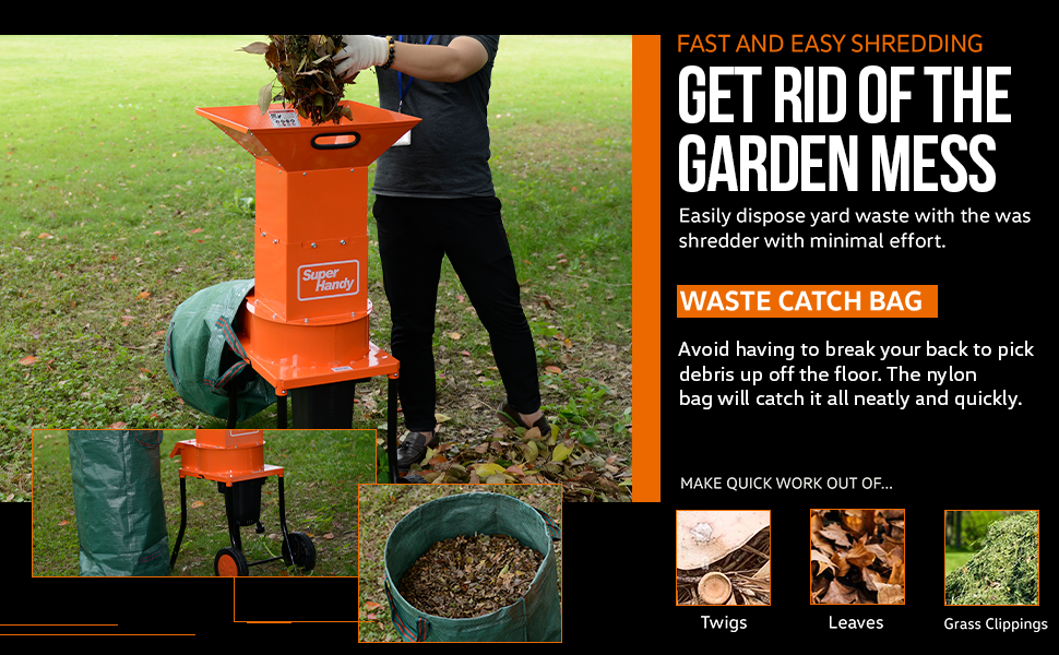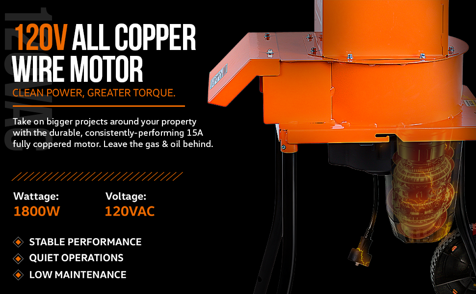 Providing consistent speeds with (3) 11″ (280mm) inch blades gyrating at 4,100RPMs. Unlike gasoline-powered chippers this electric Leaf Mulcher produces no smog and is quieter, making it ECO and USER FRIENDLY.